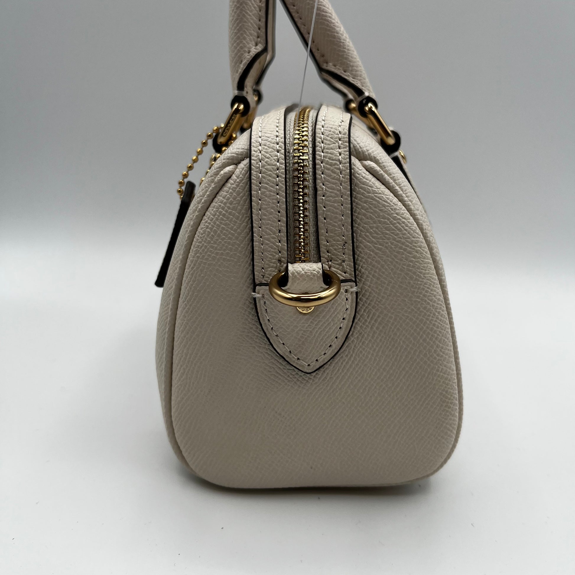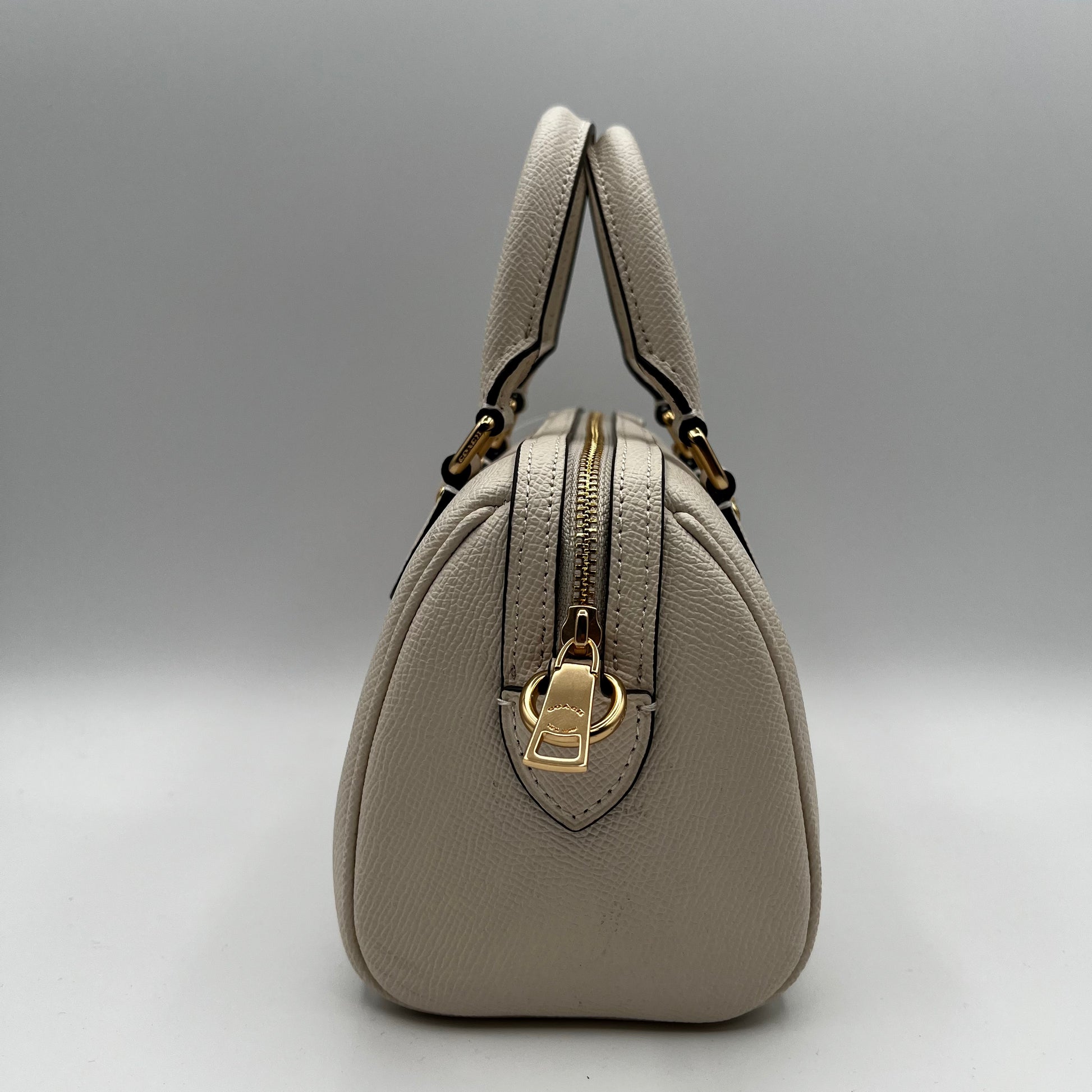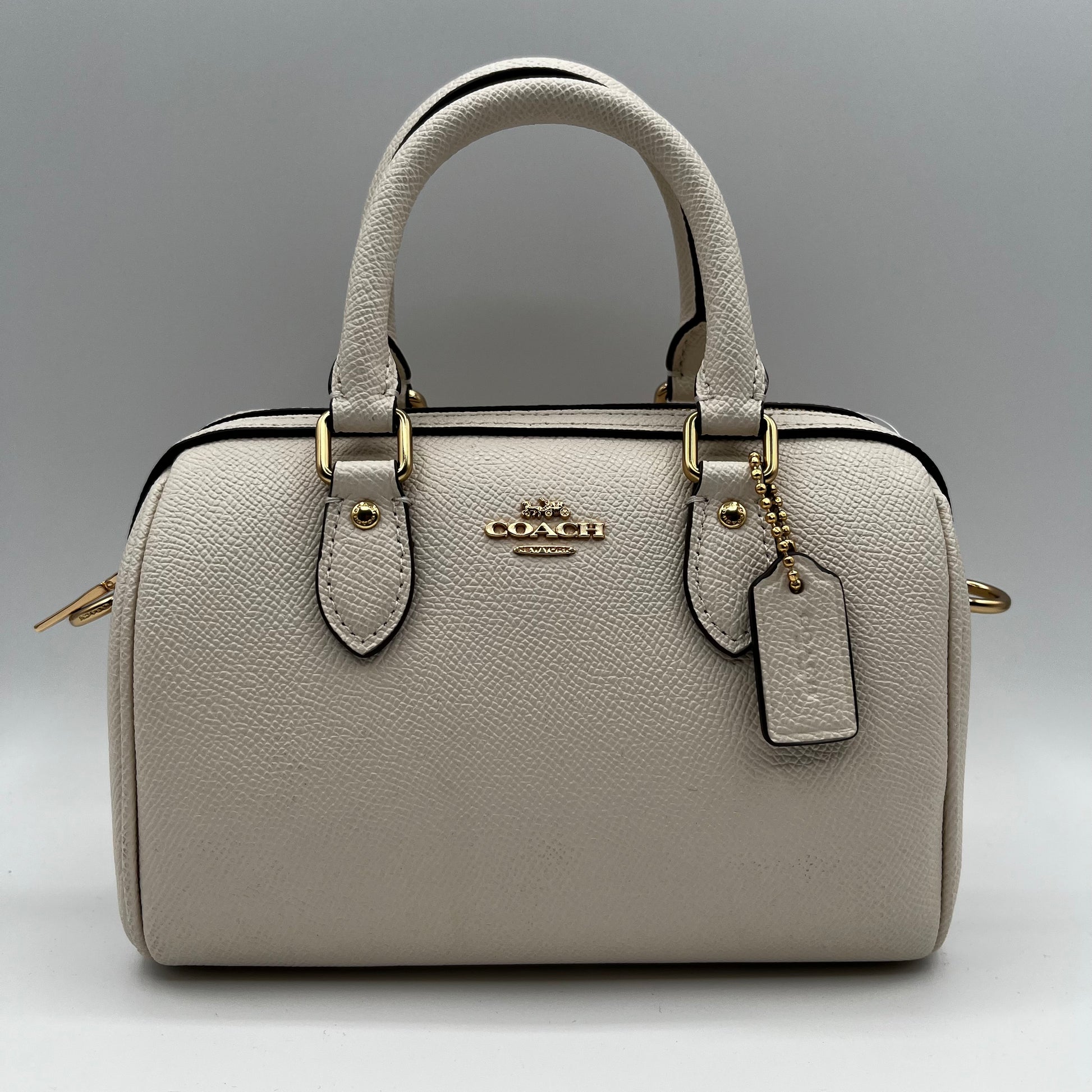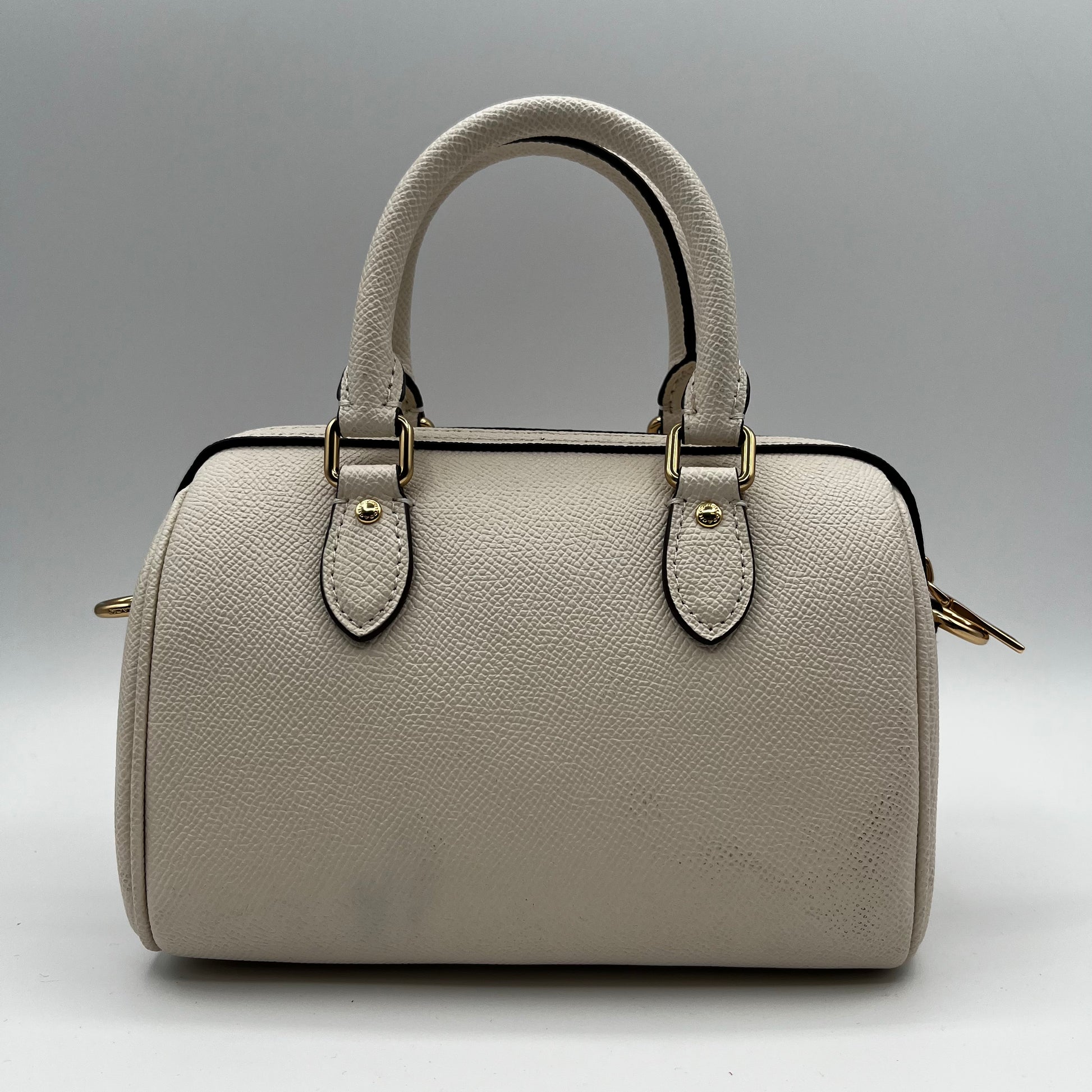 Classic and compact, this Coach beige leather top handle bag offers timeless elegance in a petite silhouette. Perfect for essentials, it features quality craftsmanship and a structured design. Pre-owned and lightly used, with some minor leather marks on the lower back of the bag.